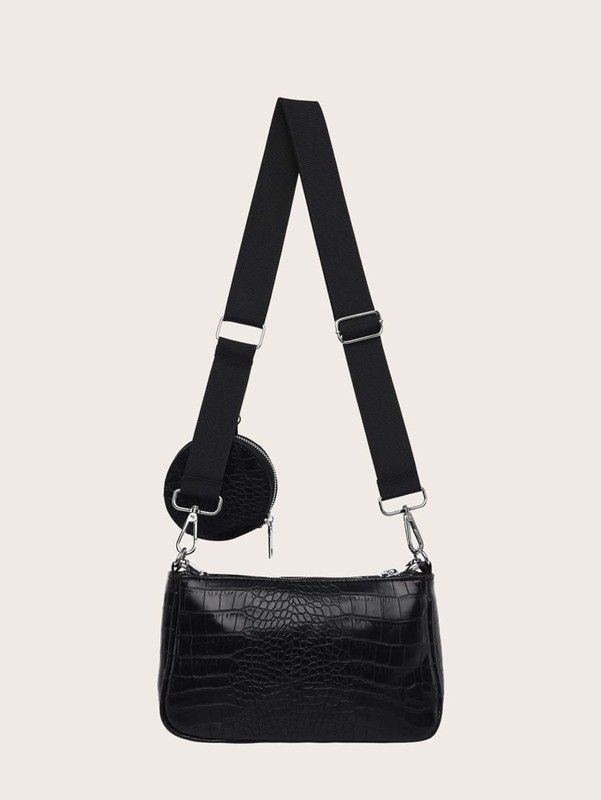 Bolsa a tiracolo preta com estampa de crocodilo composta por 3 peças. Duas bolsas em formato pochote e uma bolsa, todas removíveis, o que torna esta bolsa a tiracolo uma bolsa multifuncional. Possui um fecho geral que fecha totalmente as malas e uma delas possui bolso e fecho de correr de segurança.